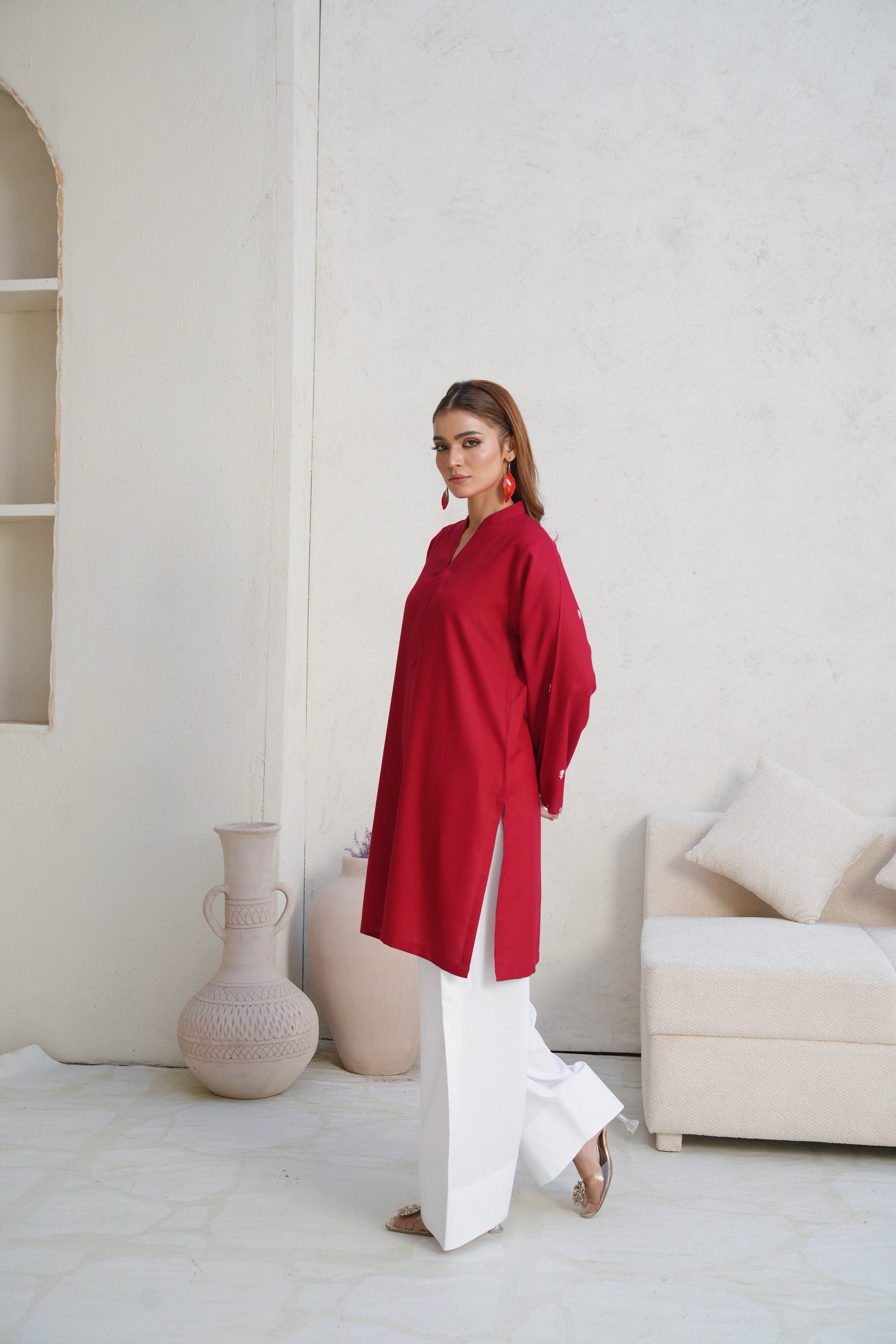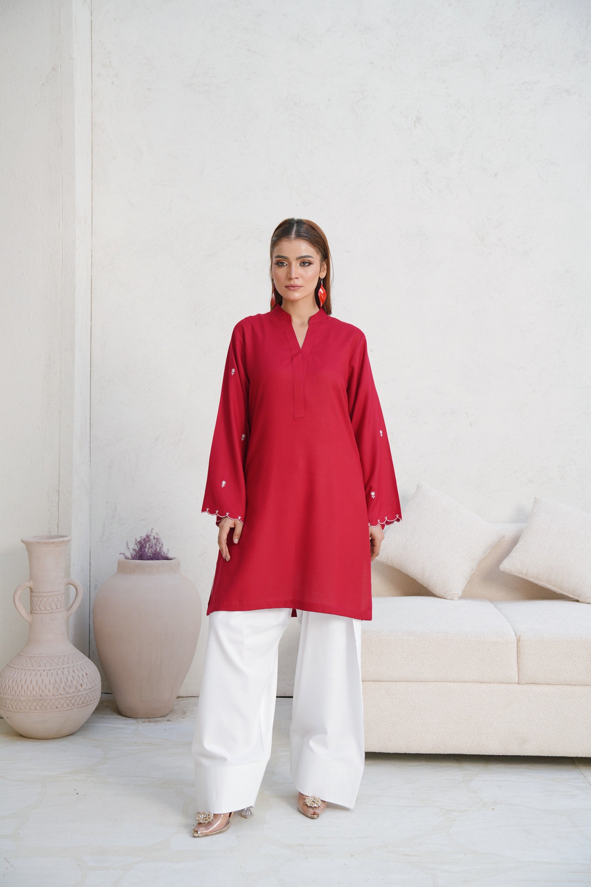 Presenting a stunning reddish maroon creation that boasts beautiful patterns all over the shirt. The scalloped edges with cutwork design adds to the intricacy of this outfit. Embrace the timeless allure of this gorgeous outfit that is a true staple for your winter wardrobe