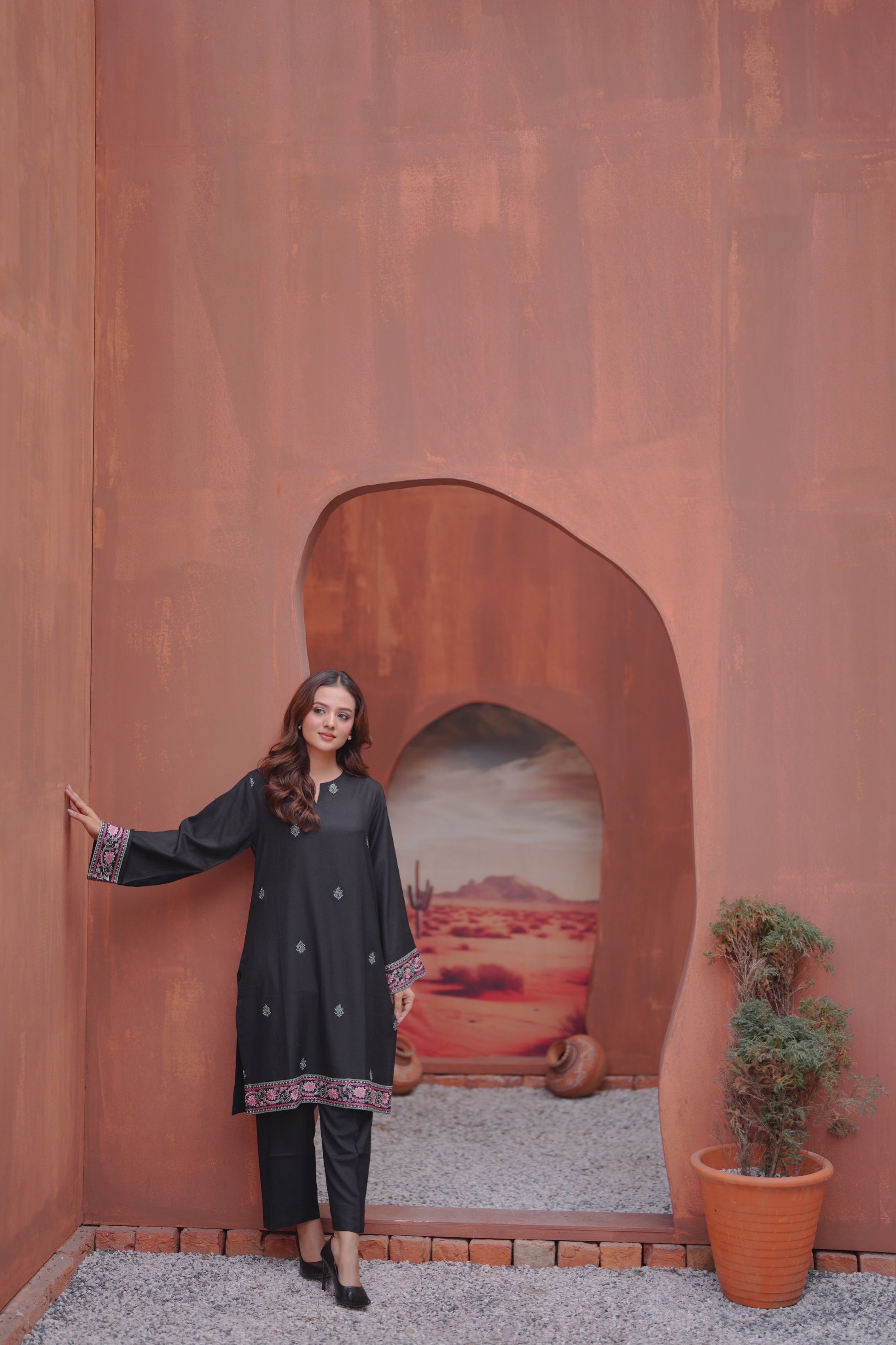 Enhance your look in a classy way with our embroidered black straight silhouette, paired with pants .